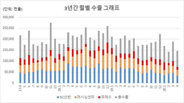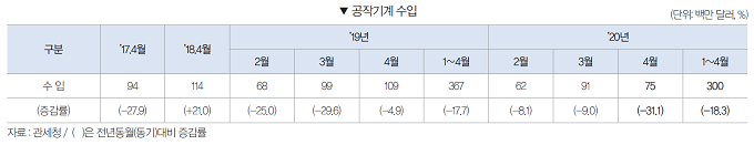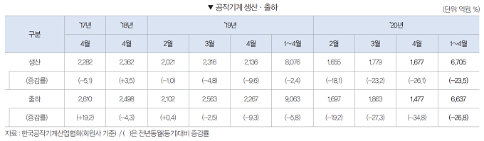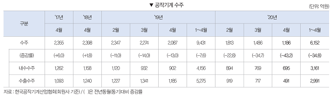 2020년 1~4월 공작기계 수주는 6,152억원으로 전년동기대비 34.8% 감소했다. 내수수주는 3,161억원으로 전년동기대비 24.0% 감소하였으며, 수출수주 또한 2,991억원으로 전년동기대비 43.3% 감소했다.