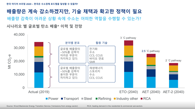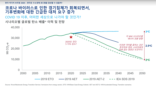 파리 기후 협약 이후 협약 체결 국가를 비롯한 많은 국가가 탄소 제로 배출을 위해 힘쓰고 있다. 우드 맥킨지는 이번 미디어 브리핑에서 자사의 ‘시나리오별 글로벌 탄소 배출 이력 및 전망’을 공개했다. 이는 2050년까지 국가가 탄소배출을 줄이지 못한다면 지구의 온도가 3℃ 오른다는 시나리오와 보다 노력해 2.5℃를 오르는 시나리오, 파리협정 내용을 지키고 목표를 달성해 2℃만 오르게 할 수 있는 시나리오로 구성됐다.