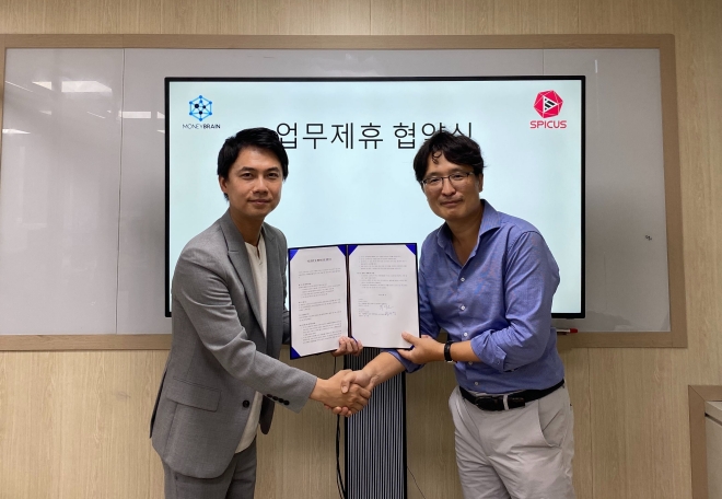 ▲(왼쪽부터) 머니브레인 장세영 대표, 스피쿠스 박인환 대표