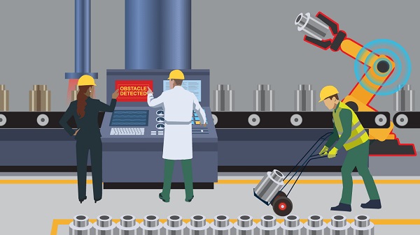 인텔리전스 에지 프로세싱(intelligent edge processing)은 공장 기계와 로봇이 인간과 상호작용을 하게 해, 사고 발생을 줄일 수 있게 한다. 예를 들면, TI 밀리미터파 센서는 기계 주변의 특정 관심 영역을 모니터링하고 제한 구역을 정해, 해당 구역이 있는 사람들에게 경고를 주도록 설정될 수 있다. 또한, 구역 밀집도와 사람 근접성에 따라 센서가 반응하도록 구역을 분할할 수 있다. 그림 2는 기계에 근접한 정도를 안전(초록색), 경고(노란색), 위험(빨간색)으로 표시한 구역을 나타낸다.