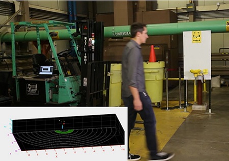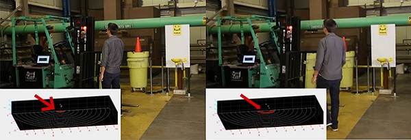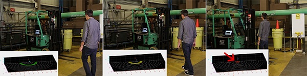 그림 2. 기계 옆을 천천히 지나가는 사람이 기계의 1m 거리까지 근접하면 위험 신호가 깜박인다.