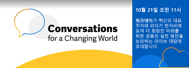 워크데이는 오는 10월 21일 오전 11시(한국시간 기준)부터 ‘변화하는 세상을 위한 대화(CCW, Conversations for a Changing World)’란 주제의 글로벌 포럼을 통해 각계 리더들이 최근의 어려운 시기를 극복할 수 있는 해답을 제시할 수 있는 기회를 제공한다고 밝혔다.