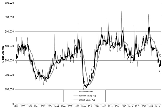 ▼ 2020년 7월 미국 공작기계 수주 현황 (Total U.S. Manufacturing Technology Orders Through July 2020)