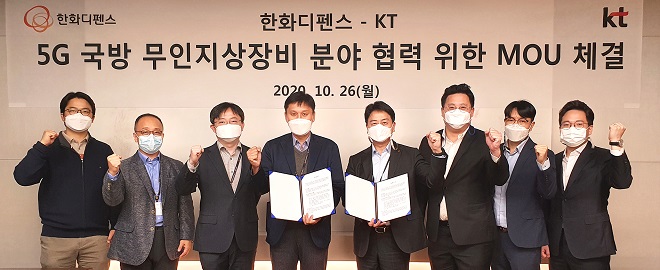 한화디펜스와 KT가 국내 최초로 국방로봇 분야에 특화된 5G 통신기술 협력에 나선다. 양사는 10월 26일 국방 무인지상장비 분야 전반에 걸친 협력과 제휴를 위해 양해각서(MOU)를 체결했다.