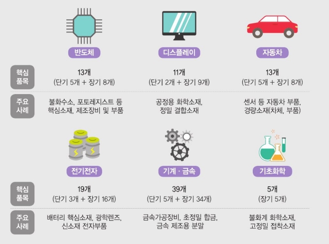 국가 안보적·산업적 중요성, 대체 가능성, 기술 수준, 특정국가 의존도, 주력산업과 신산업의 생산에 미치는 영향 등 5개 분석기준을 토대로 업계 의견과 전문가 검토를 거쳐 반도체, 디스플레이, 자동차, 전기전자, 기계금속, 기초화학 6대 분야 100대 핵심 전략품목을 선정했다.