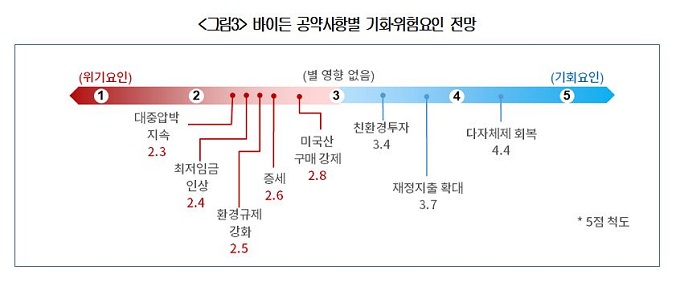 조사 결과 '다자무역체제 회복'(4.4점), '재정지출 확대'(3.7점), '2조 달러의 친환경투자'(3.4점) 등이 기회요인으로 평가됐고, '중국 압박 지속'(2.3점), '최저임금 인상'(2.4점), '환경규제 강화'(2.5점) 등은 위기요인으로 인식됐다.