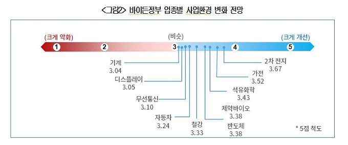 미국의 친환경 투자와 경기부양 수혜가 기대되는 2차전지, 가전, 석유화학 업종에서는 개선 기대가 비교적 높았지만, 미국산 사용이 강화되고 중국과 경쟁이 치열한 기계와 디스플레이, 무선통신 업종에선 기대가 상대적으로 낮았다.