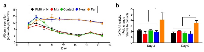 그림. 혈관내피세포와 간세포 스페로이드의 거리에 따른 간세포 스페로이드의 기능성