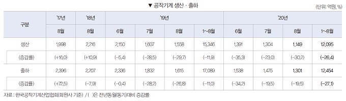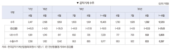 2020년 1~8월 공작기계 수주는 1조2,203억원으로 전년동기대비 25.6% 감소했다. 내수수주는 5,806억원으로 전년동기대비 19.7% 감소하였으며, 수출수주 또한 6,397억원으로 전년동기대비 30.3% 감소했다.