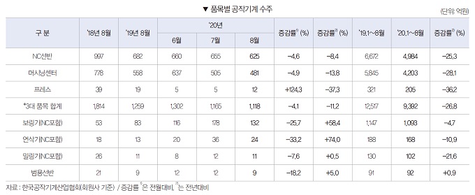 2020년 8월 품목별 수주를 보면, NC절삭기계는 전월대비 14.9% 감소한 1,345억원을, 범용절삭기계는 전월대비 19.1% 감소한 26억원을 기록했다. 반면 성형기계는 전월대비 41.5% 증가한 21억원을 기록했다.