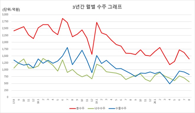 7월에 이어 8월도 수주 감소세를 겪었다. 2개월 연속 감소세다. ‘코로나19’의 영향이 여전히 존재하는 가운데, 여름 휴가 시즌의 여파도 이번 감소세를 이끄는 데 한 몫 했다.