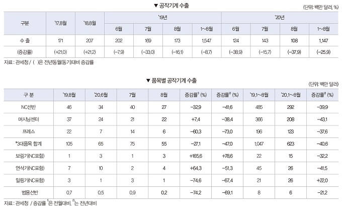 2020년 8월 공작기계 수출은 1억800만 달러로 전월대비 24.6% 감소했다. 전년동월과 비교해서는 37.9% 감소했다. 2020년 1∼8월 공작기계 수출은 11억4,700만 달러로 전년동기대비 25.9% 감소했다.