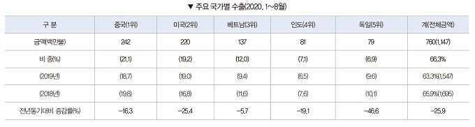 아시아 지역 중 중국(3,000만 달러, -34.8%), 베트남(1,700만 달러, -5.9%), 인도(400만 달러, -45.1%), 일본(200만 달러, -43.6%), 태국(200만 달러, -20.5%) 지역 모두 전월대비 감소했다.