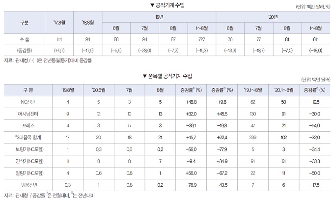 2020년 8월 공작기계 수입은 8,100만 달러로 전월대비 5.9% 증가하였다. 전년동월대비로는 7.0% 감소했다. 2020년 1∼8월 공작기계 수입은 6억1,100만 달러로 전년동기대비 16.0% 감소했다.