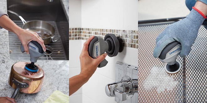 ▲(왼쪽부터) 드레멜 다용도 만능 클리너 ‘버사 PC 10-01’에 논스크래치 패드, 나일론 솔 브러시, 연마형 고성능 패드를 장착해 사용하는 모습