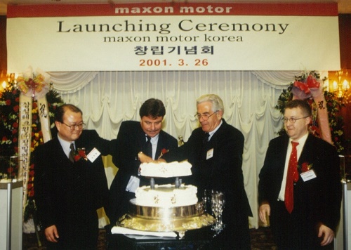 ▲ 2001년 맥슨모터코리아 창립기념식. (좌측부터) 설호철 맥슨모터코리아 회장, 칼왈터 브라운 맥슨 그룹 회장, 유르겐 마이어 맥슨 그룹 명예 회장, 오이겐 엘미거 맥슨 그룹 CEO