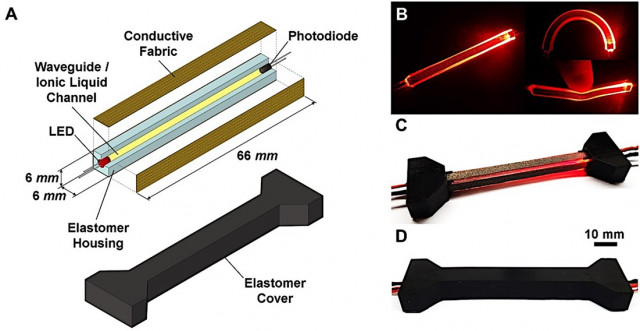이번 연구에서 개발된 센서는 실리콘 고무 재질로 만들어져 있다. 막대 형태의 구조 내부에 속이 빈 미세한 관(microchannel)이 있고 이 관은 전기 전도성이 있는 투명한 이온 용액으로 채워져 있다. 그리고 센서 구조 외벽에는 얇은 전도성 직물이 부착돼 있다.