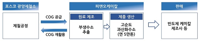 피앤오케미칼은 부생수소를 원료로 과산화수소를 제조한다. 광양제철소의 코크스오븐가스(Cokes Oven Gas, 이하 COG) 배관망을 생산공장에 연결하고 수소를 정제·추출하는 방식이다. 기존의 LNG(천연가스) 추출 방식과 비교해 원료비가 낮고 수소 추출을 마친 COG를 다시 제철소에 공급해 재활용하기 때문에 경제성을 높일 수 있는 방식으로 알려져 있다.