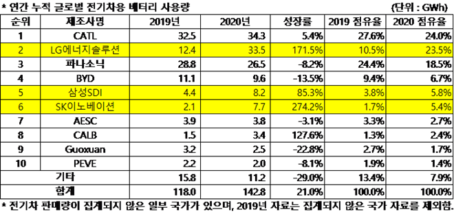 2020년 연간 판매된 글로벌 전기차(EV, PHEV, HEV) 탑재 배터리 사용량 순위에서 LG에너지솔루션과 삼성SDI, SK이노베이션이 각각 2위와 5위, 6위를 차지했다.