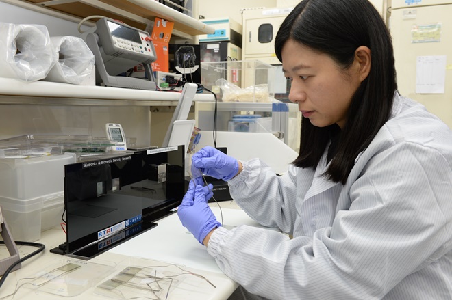 ▲ETRI 오지영 책임연구원이 초고감도 압력센서를 이용한 소자를 제작하고 있는 모습.