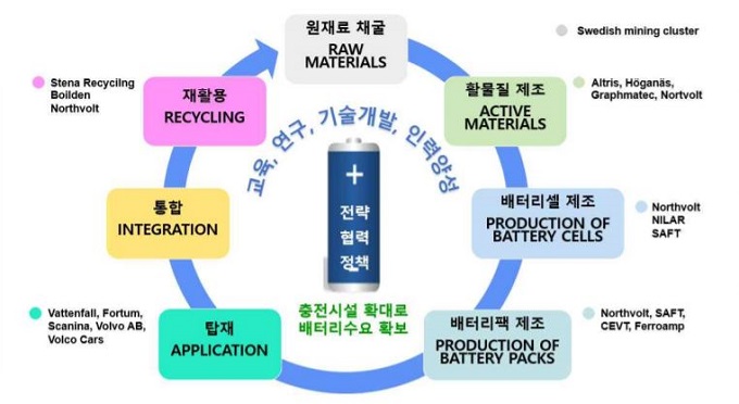 배터리 밸류체인 전반에 걸쳐 탄탄한 기술 및 산업기반을 갖춘 스웨덴은 원자재 채굴, 배터리 생산, 유통, 재활용 등 배터리 밸류체인 전 주기에 EU의 주요 아젠다인 그린딜·탄소중립을 적용해 EU 배터리산업의 리더로 도약함과 동시에 이를 국가 산업경쟁력 강화의 기회로 삼겠다는 계획이다.