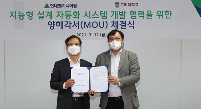 현대엔지니어링이 지난 12일 고려대학교와 지능형 설계 자동화 개발을 위한 상호 협력 양해각서(MOU)를 체결했다고 14일 밝혔다. 행사에서 관계자들은 설계 자동화 시스템과 관련된 연구 성과들을 공유하고 향후 협력에 대한 다양한 방안들을 협의했다.