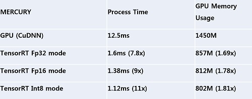 ※Tensor RT 지원을 통해 GPU 메모리 사용량이 2배 증가할 경우 9배 이상의 성능 향상 가능