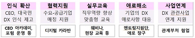 인식제고를 위해 중견기업CEO 디지털 인식전환을 위한 아카데미 및 산학연 포럼을 운영하고, 역량강화를 위해서는 디지털 전환의 실질적 구현을 위한 전문 인력 4,000명 내외 양성, 실행지원을 위해서는 공급-수요기업간 맞춤형 매칭을 위한 찾아가는 디지털 카라반 및 디지털 전환 실행을 위한 밀착형 멘토링 등을 진행하게 된다.