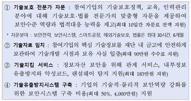 기존 분야별로 나눠져 있던 기술보호 지원사업(기술자료 임치, 기술지킴 서비스, 법무지원, 보안자문, 보안시스템 구축 등)이 중소기업의 신청에 따라 일회성이고 단편적 지원이라는 의견이 있었다.