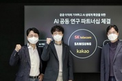 [헬로티] SKT, 삼성전자, 카카오 3사는 사회 안전에 이바지하기 위해 AI 기술 개발에 협력하기로 했다고 22일 밝혔다. ▲삼성전자 무선사업부 AI팀 우경구 상무, 카카오브레인 박승기 대표, SKT 김윤 CTO가 AI 공동 연구 파트너십을 체결하고 기념촬영을 하고 있다 3사는 이번 AI 동맹으로 각 사가 가진 핵심 역량을 모아 ▲미래 AI 기술 개발 ▲사회적 난제 해결을 위한 AI 활용 방안 연구 ▲AI 기술 저변 확대를 공동 추진할 것이라고 발표했다. 특히 코로나19가 국가 경제·사회에 심각한 영향을 끼치는 중대한 시점이기에 코로나 조기 극복과 공공 이익을 위한 AI 개발에 초점을 맞춰 협력을 진행하기로 했다. 이를 위해 3사는 ‘AI R&D 협의체’를 결성했다. 향후 국내 타 사업자 참여는 물론 글로벌 AI 동맹체 수준으로 규모 확대를 검토할 예정이다. 3사 협력은 1월 CES 2020에서 박정호 SKT CEO가 세계에서 AI 주도권을 잡기 위해서는 국내기업 간 경쟁보다는 협력이 필요한 시기라며 국내 기업들간의 협력을 강조하면서 시작됐다. SKT, 삼성전자, 카카오는 각각 이동통신 서비스, 스마트 디바이스, 메